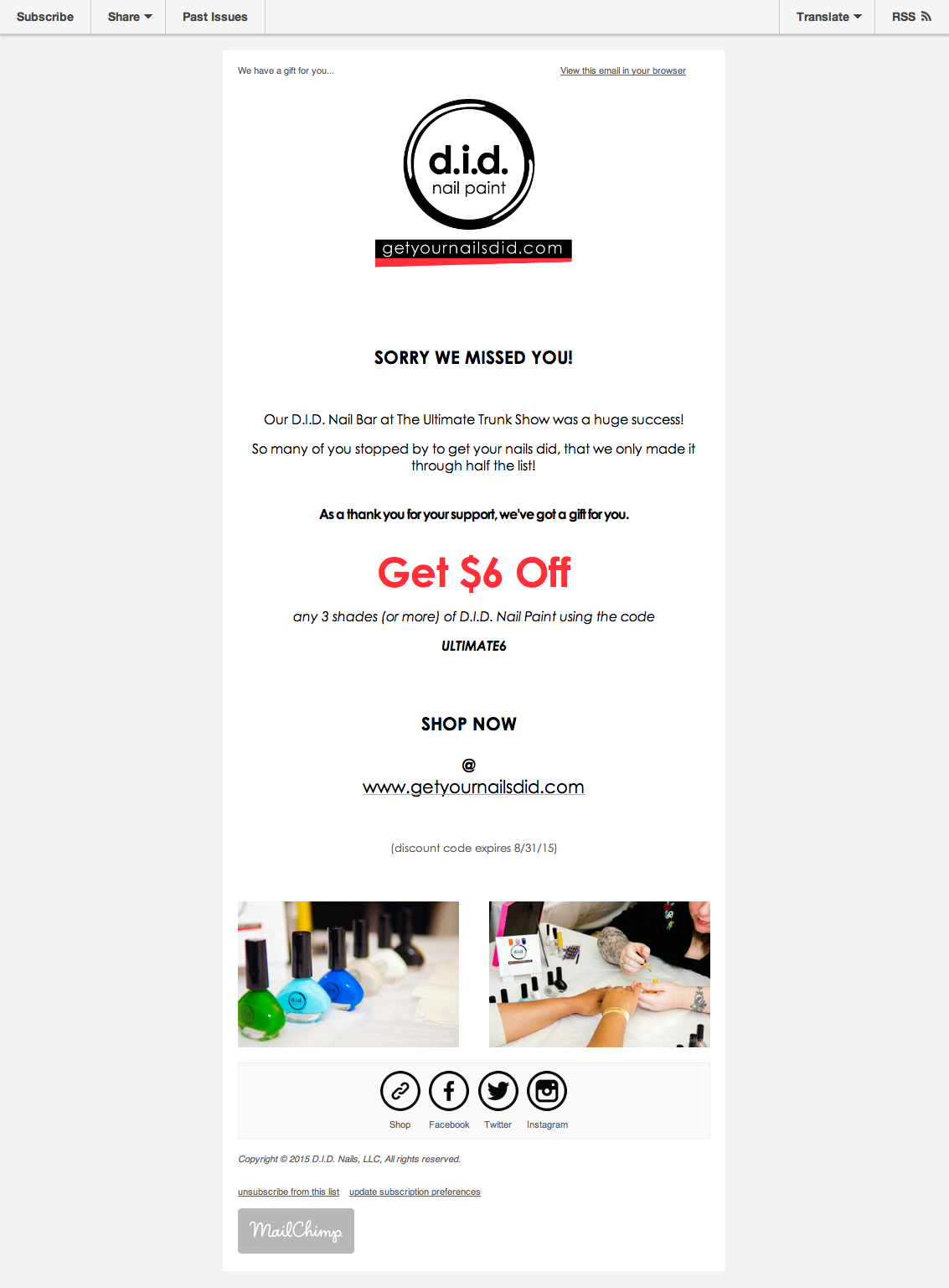 D.I.D. Nail Paint | Product Launch Email Nude Collection Product Launch Email SUBJ: Full Frontal! The big reveal for our new Nude Collection! Customer Retention Promo Email SUBJ: $6 Off for My Woes OPEN RATE: 43% CTR: 7%