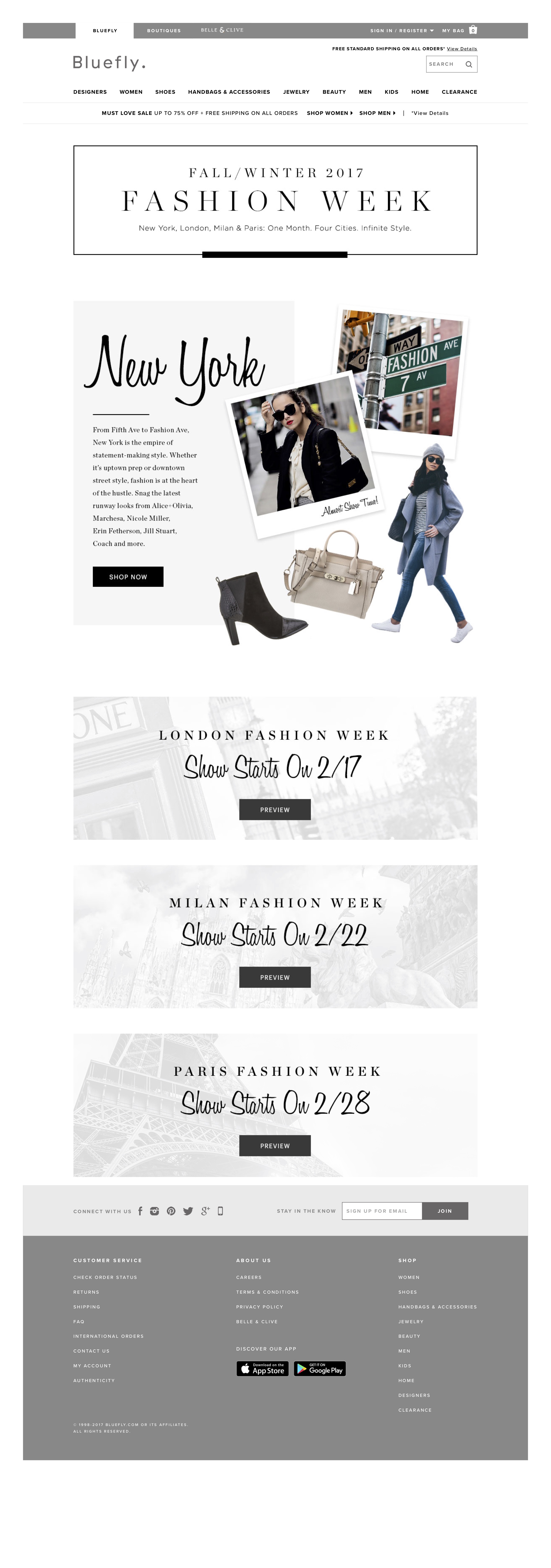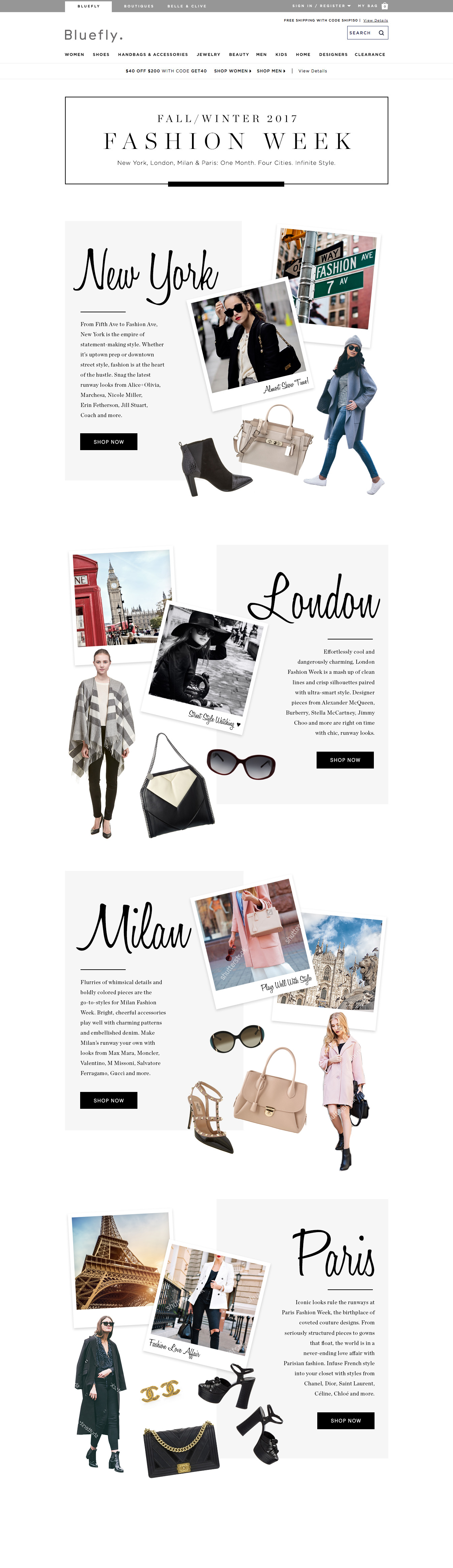 For this Fashion Month campaign, I acted as creative director, copy director annnnd project manager. Each city—New York, London, Paris and Milan—and its product assortment launched onsite as shows began.